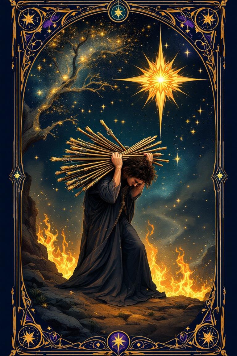 The Ten of Wands carries an impossible burden. Success has brought heavy responsibilities — learn to delegate before the weight breaks you.