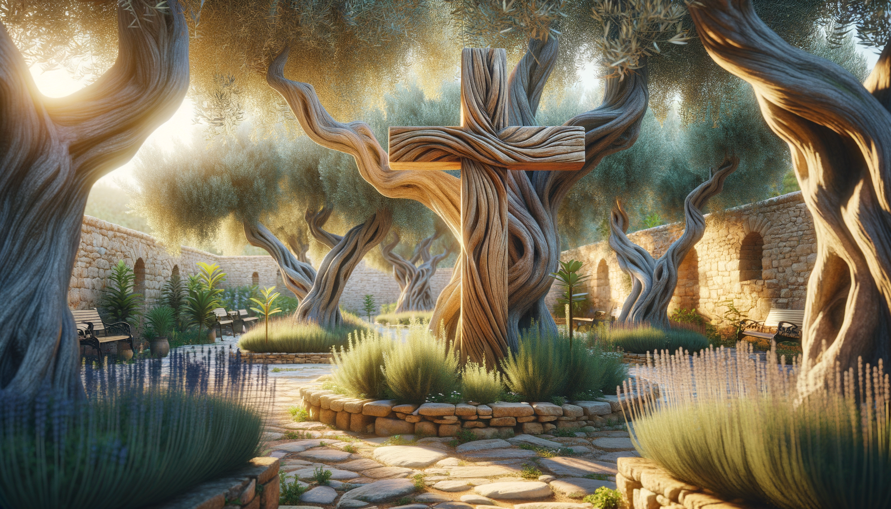 Free Cross / Christian Symbol Olive Garden Wallpaper in HD and 4K. Original AI-generated spiritual artwork.