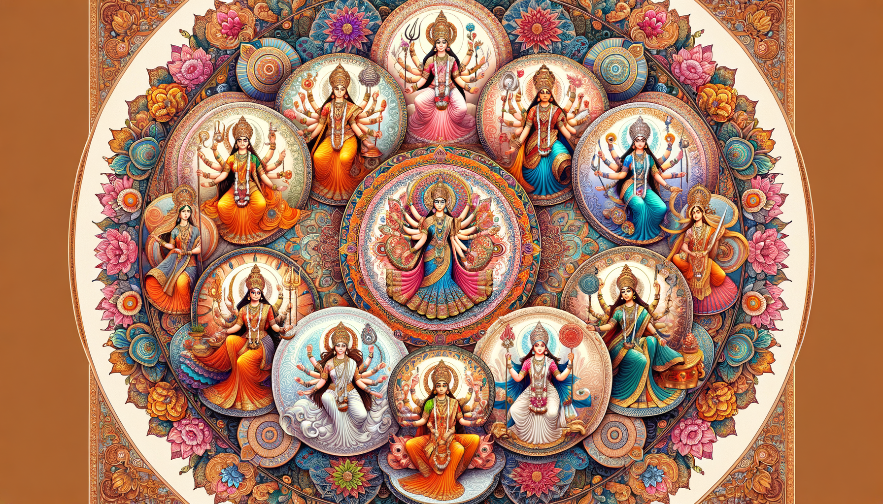 Free Navratri Nine Forms Wallpaper in HD and 4K. Original AI-generated spiritual artwork for desktop, phone, and tablet.