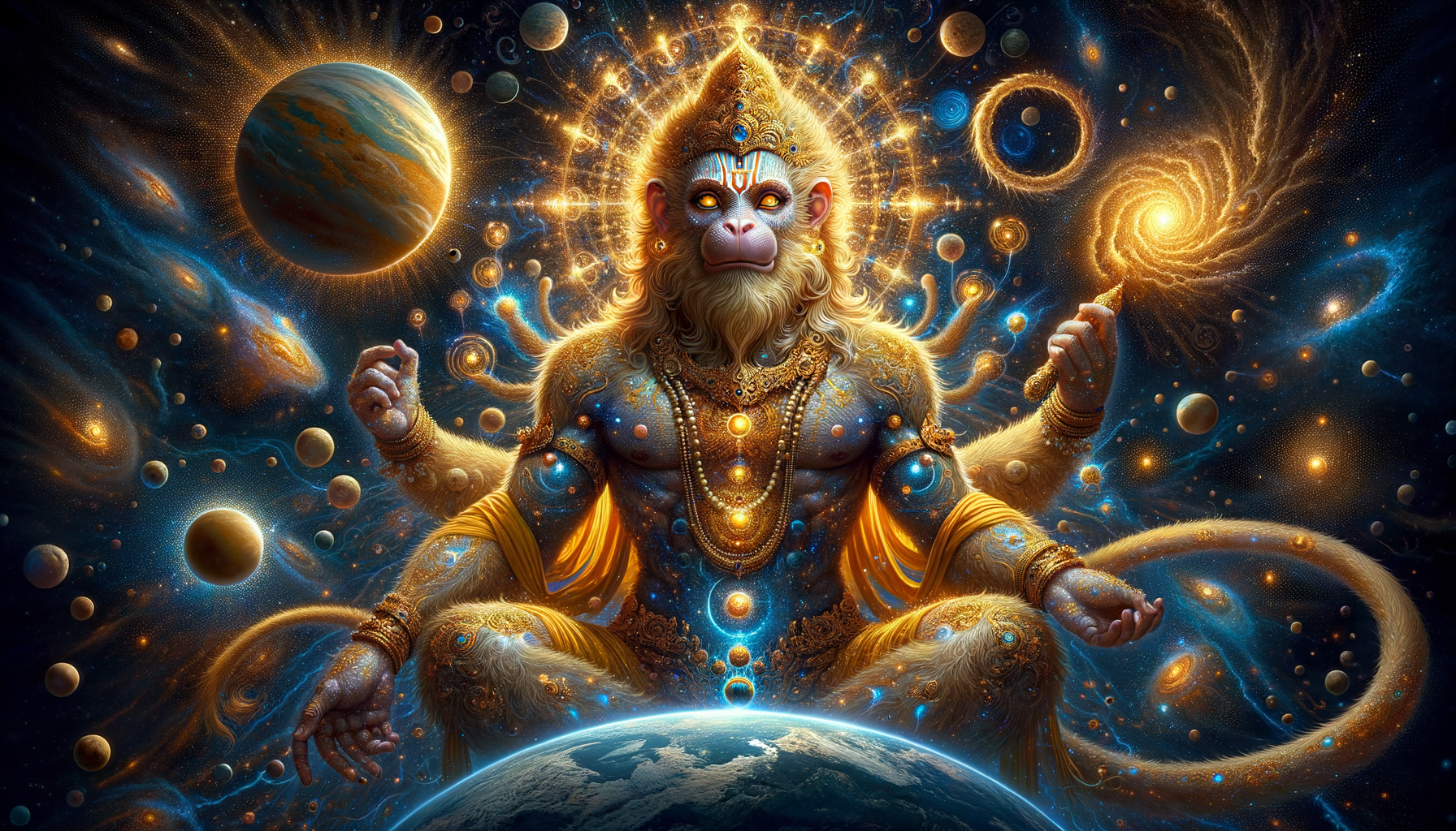 Free premium Lord Hanuman Cosmic Form Wallpaper in HD and 4K. Lord Hanuman, the mighty monkey god, rendered with devotion and artistic excellence.