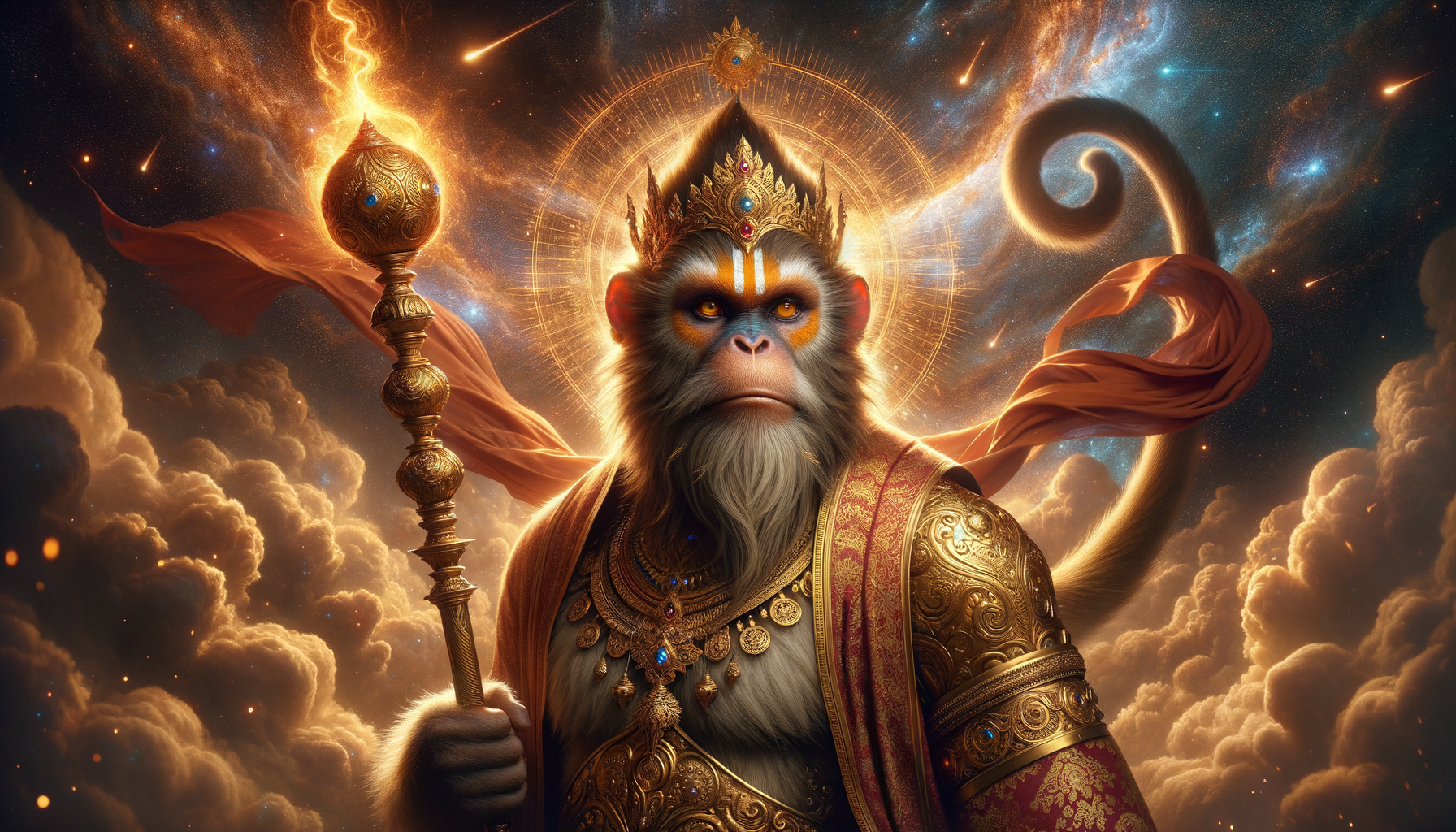 Free premium Lord Hanuman Cosmic Warrior Wallpaper in HD and 4K. Lord Hanuman, the mighty monkey god, rendered with devotion and artistic excellence.