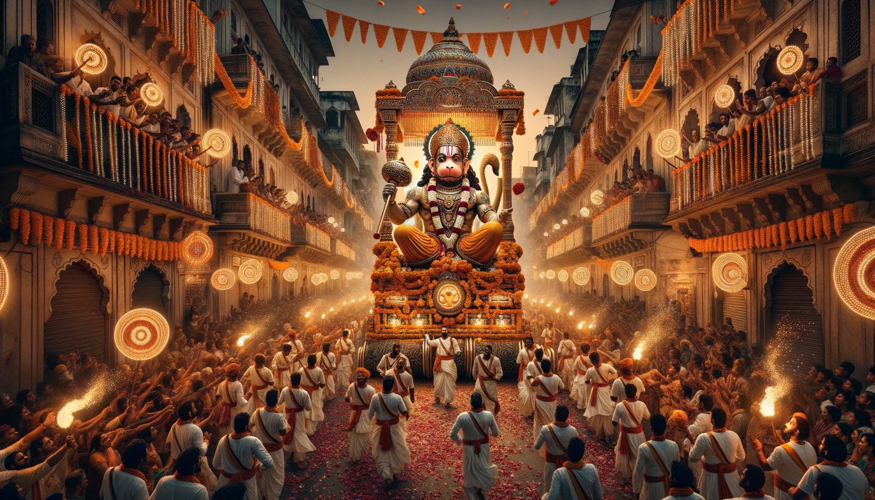 Free premium Lord Hanuman Festival Procession Wallpaper in HD and 4K. Lord Hanuman, the mighty monkey god, rendered with devotion and artistic excellence.