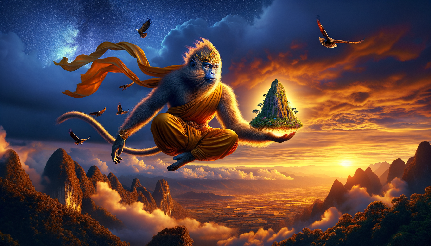 Free premium Lord Hanuman Lifting Mountain Wallpaper in HD and 4K. Lord Hanuman, the mighty monkey god, rendered with devotion and artistic excellence.