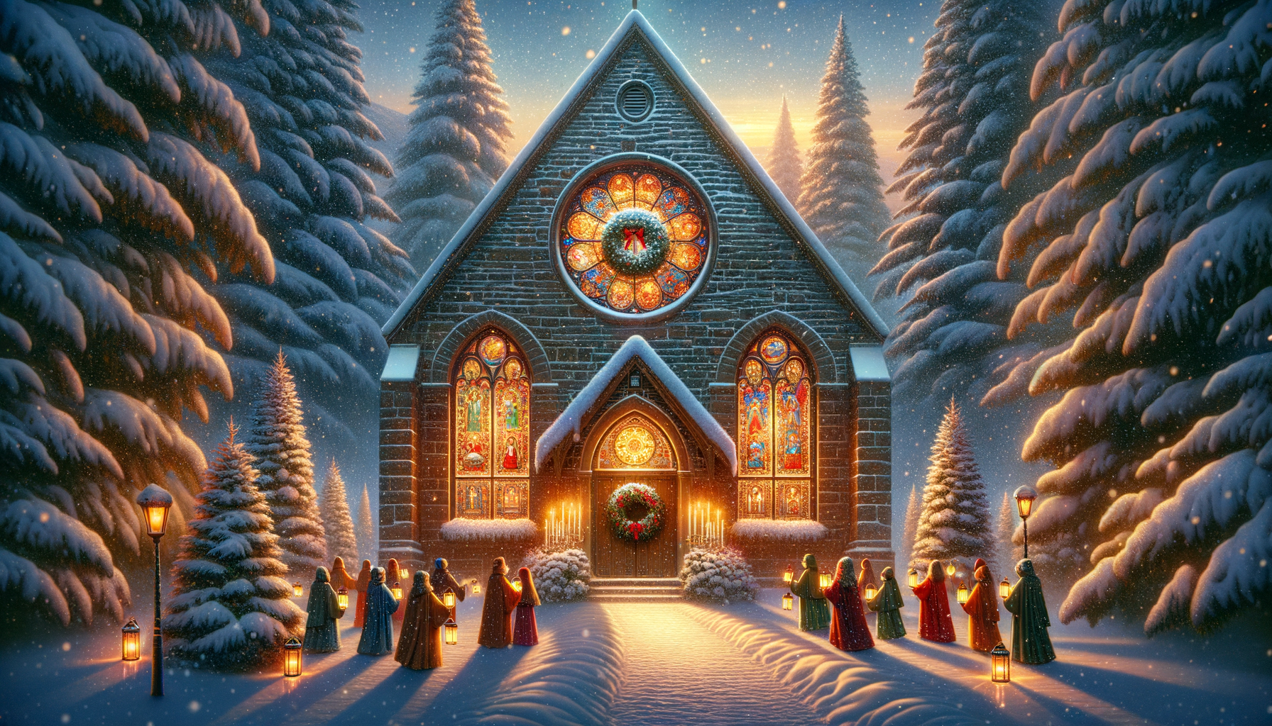Free Christmas Winter Church Wallpaper in HD and 4K. Original AI-generated spiritual artwork for desktop, phone, and tablet.
