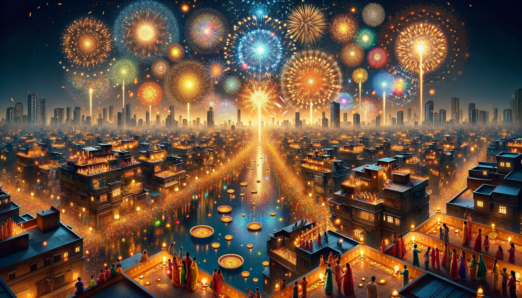 Free Diwali Fireworks Night Wallpaper in HD and 4K. Original AI-generated spiritual artwork for desktop, phone, and tablet.